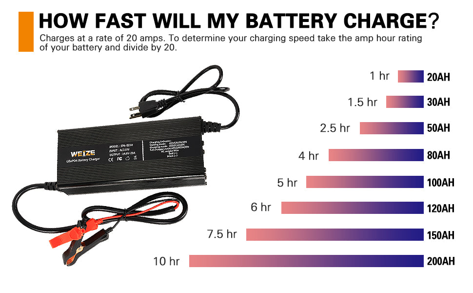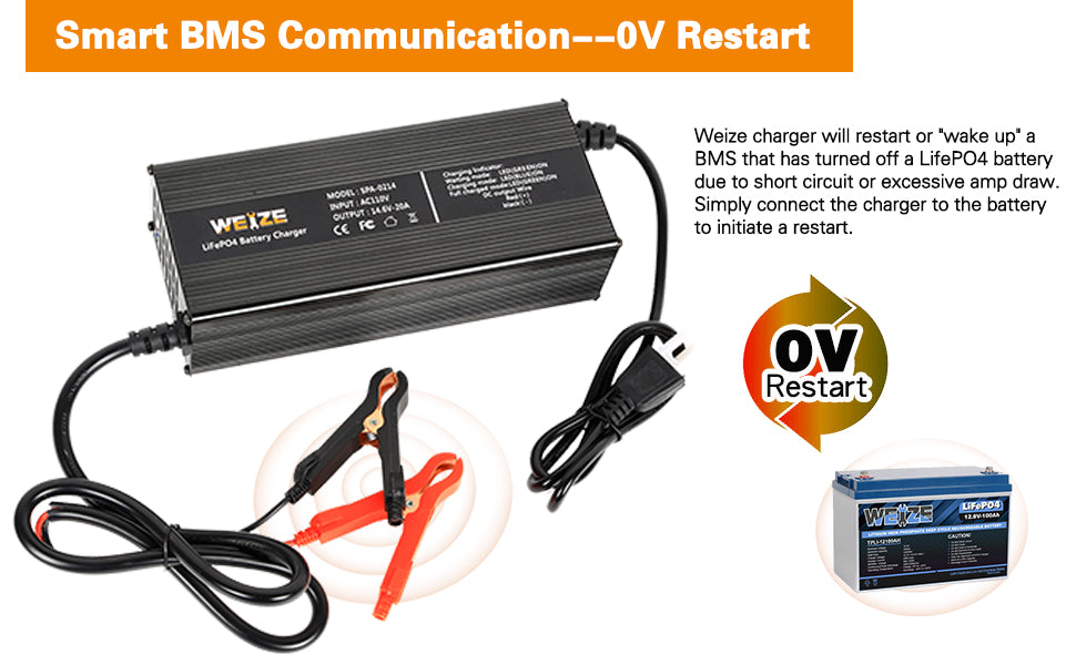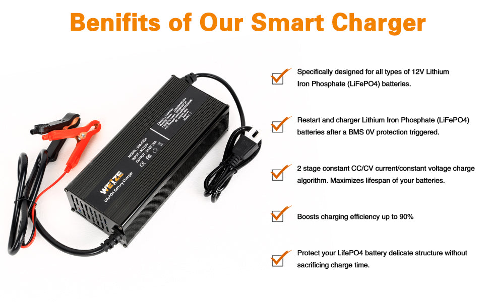 Elevate your power experience with the WEIZE Lithium Battery Smart Charger - a charger designed to fuel your adventures and amplify your energy. Take control of your 12V LiFePO4 batteries like never before!