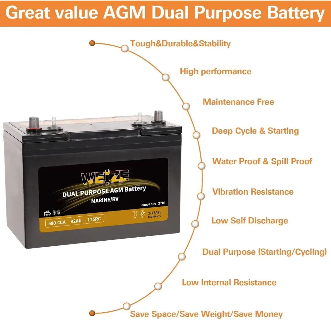 WEIZE BCI Group 27M 12V 92AH Dual Purpose AGM Battery, Starter & Deep Cycle, Marine & RV Battery