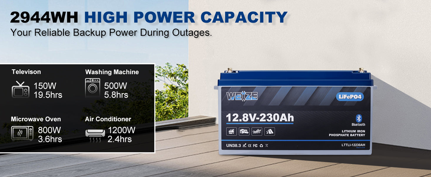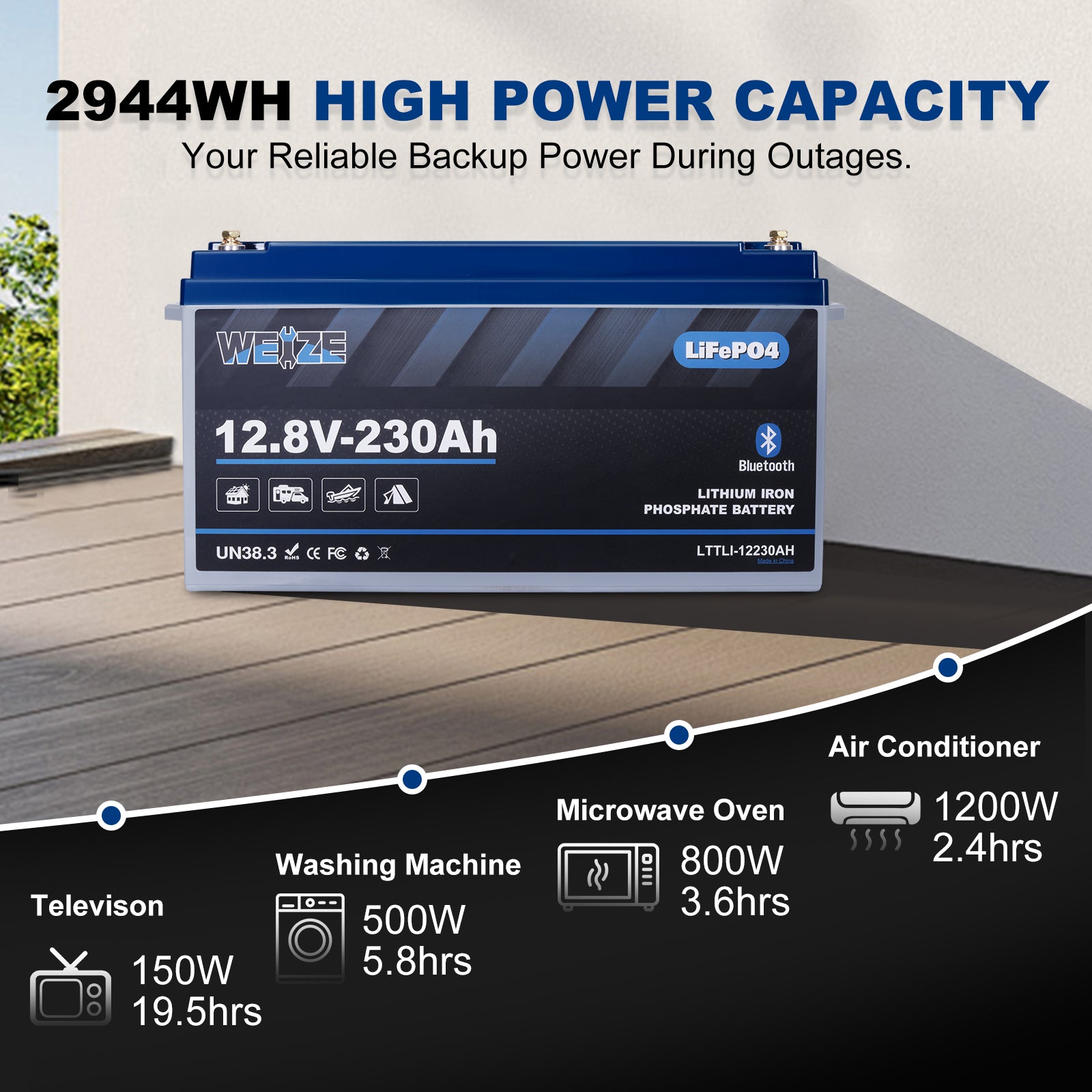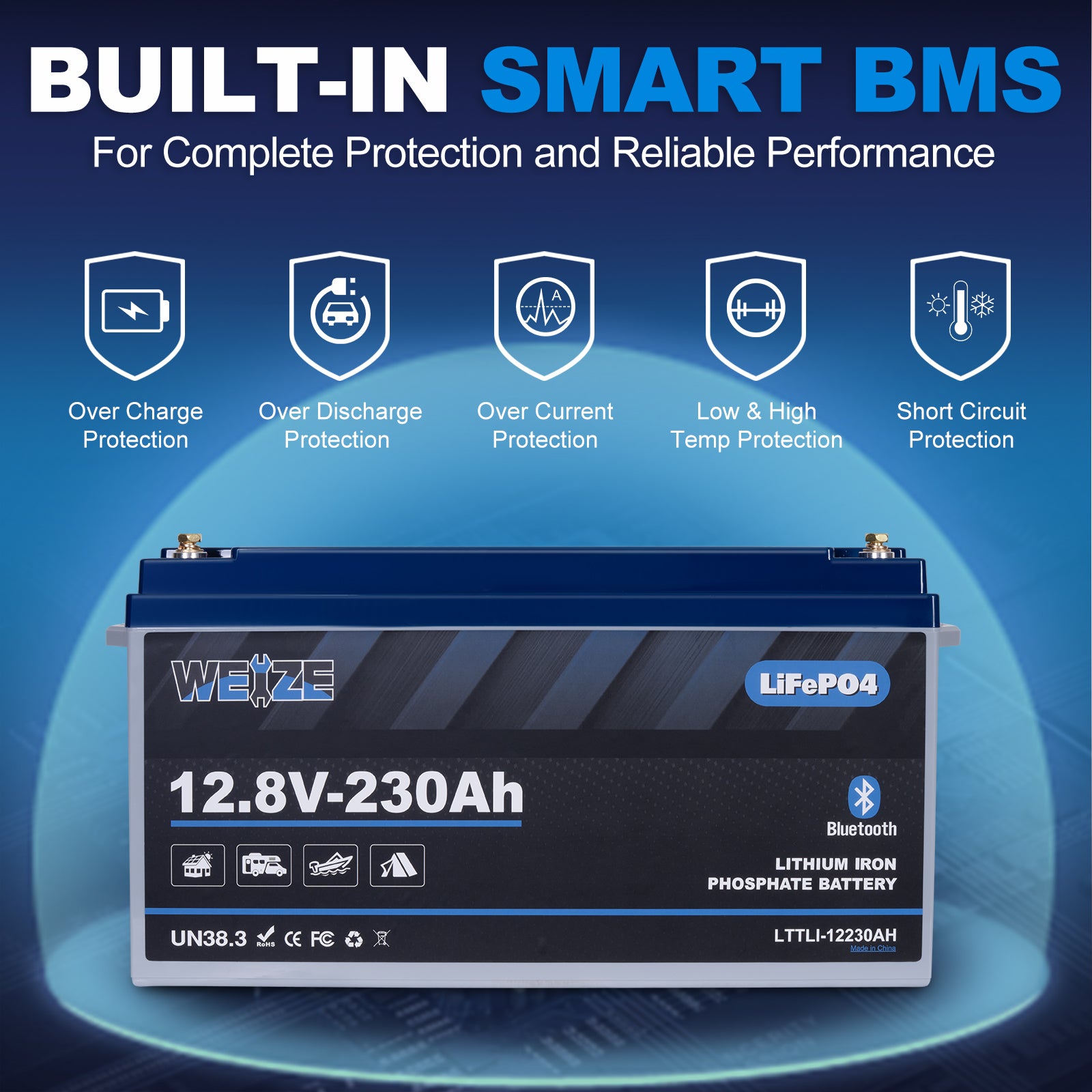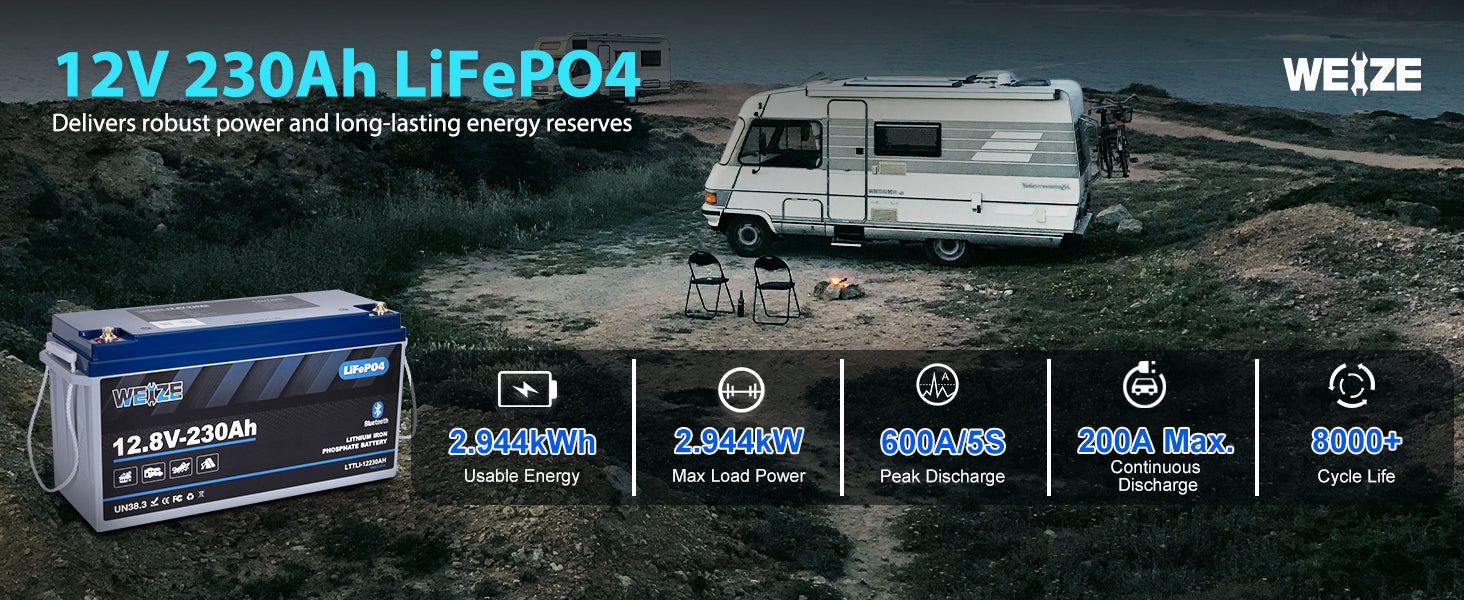 WEIZE 12V 230Ah Bluetooth LiFePO4 Lithium Battery 200A BMS & Low-Temp Protection, Deep Cycle, Peak 600A, Perfect for RVs, Solar & Off-Grid Adventures