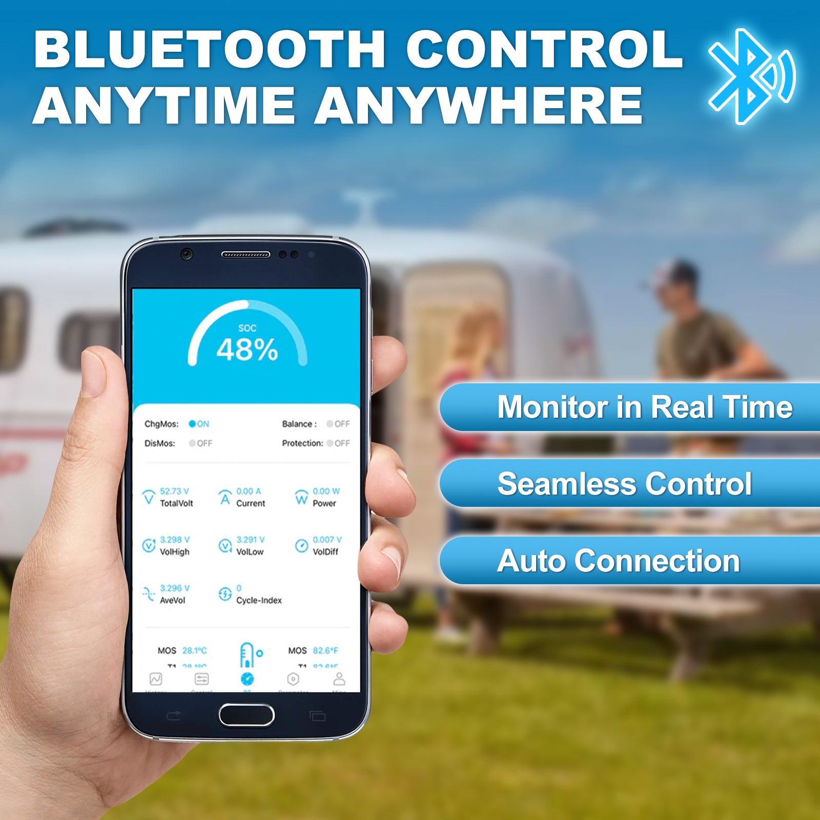 ✅ Smart 200A BMS: The built-in Battery Management System protects against overcharge, over-discharge, overcurrent, short circuits, and extreme temperatures. The BMS automatically cuts off the battery if necessary and safely reactivates within seconds—no extra voltage required.