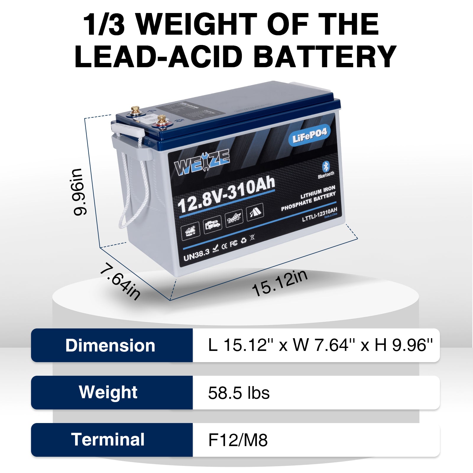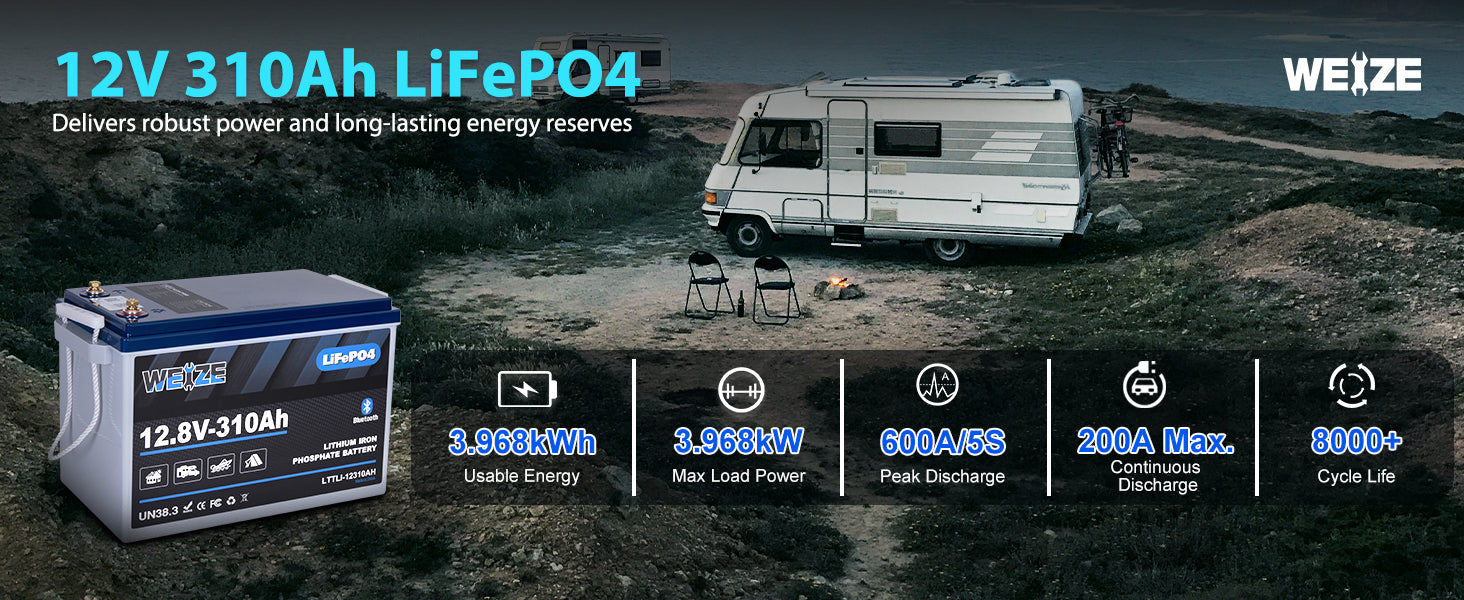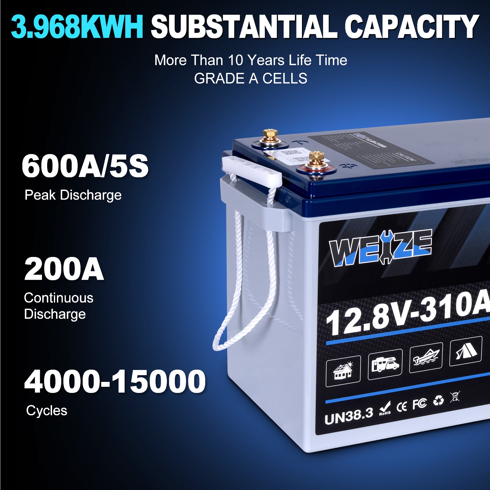 WEIZE 12V 310Ah Bluetooth LiFePO4 Lithium Battery 200A BMS & Low-Temp Protection, Deep Cycle, Peak 600A, Perfect for RVs, Solar & Off-Grid Adventures