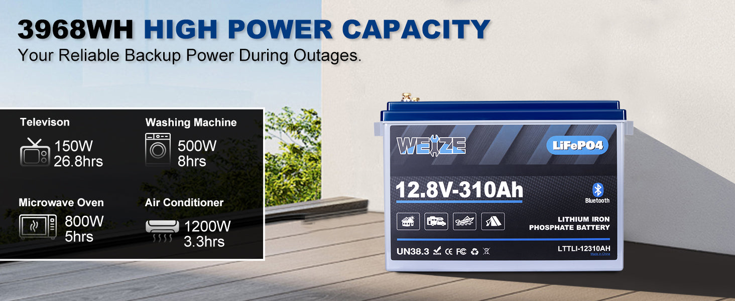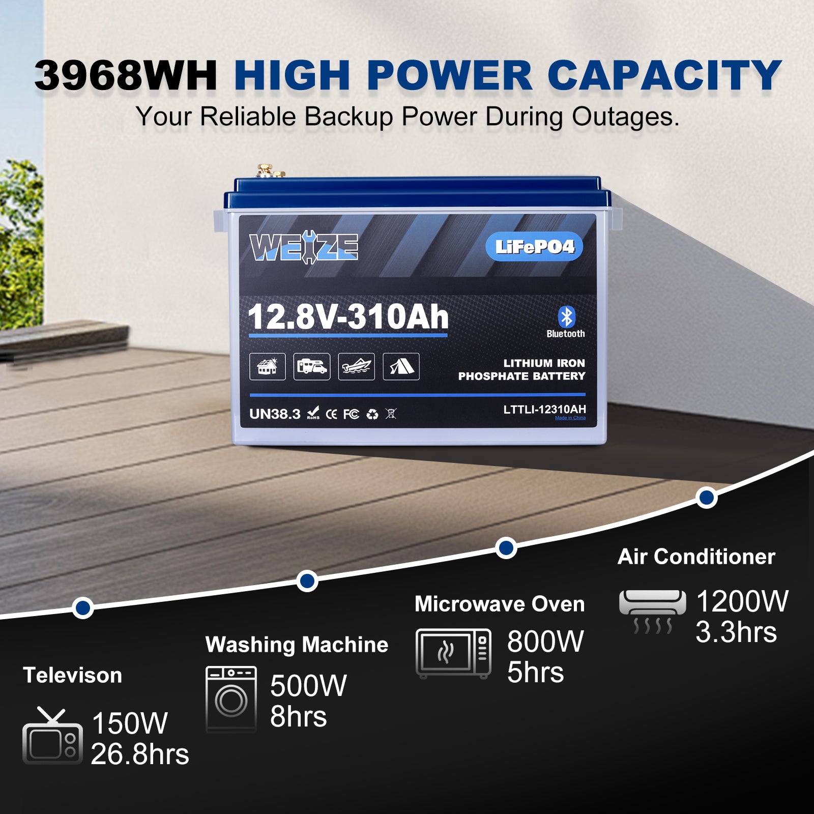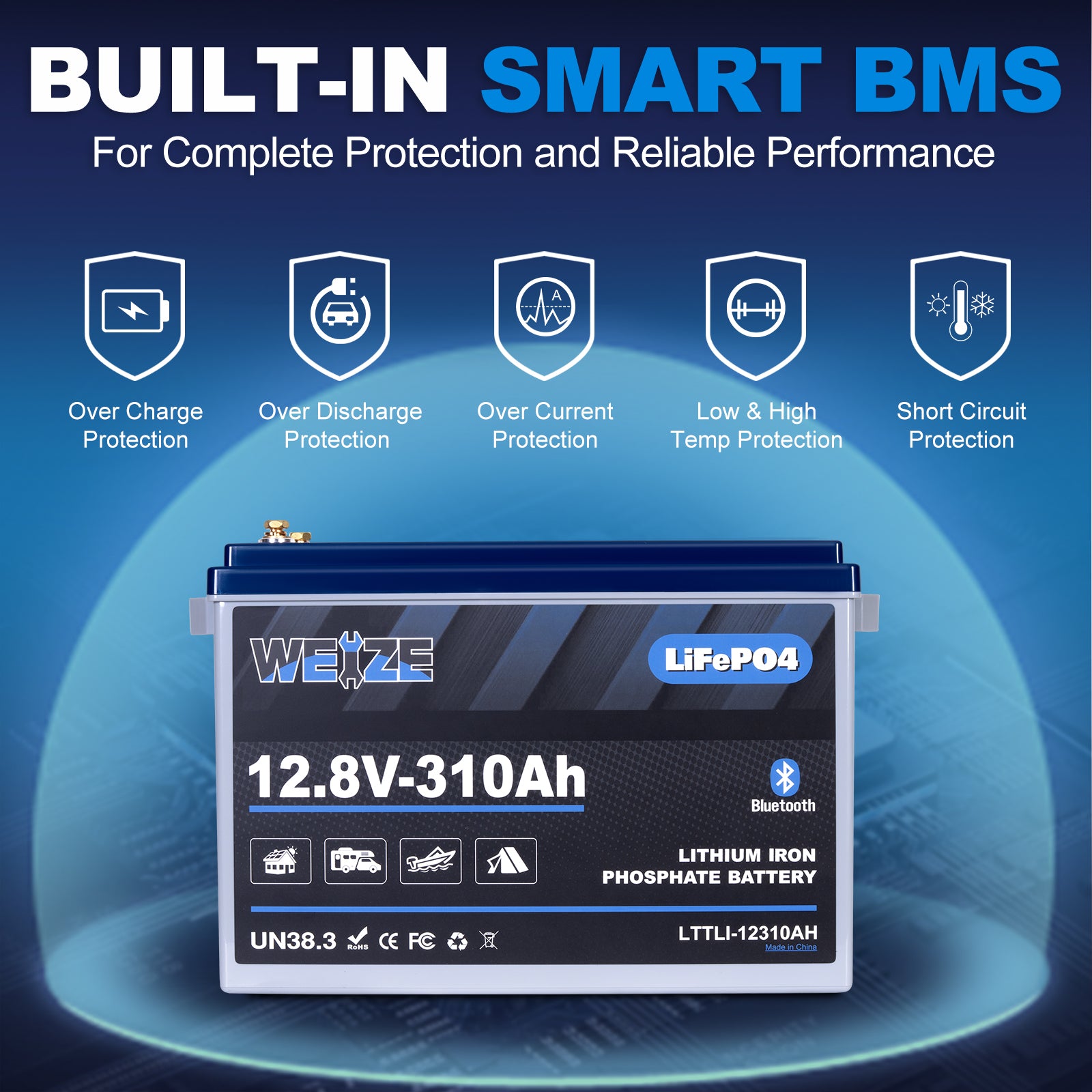 WEIZE 12V 310Ah Bluetooth LiFePO4 Lithium Battery 200A BMS & Low-Temp Protection, Deep Cycle, Peak 600A, Perfect for RVs, Solar & Off-Grid Adventures