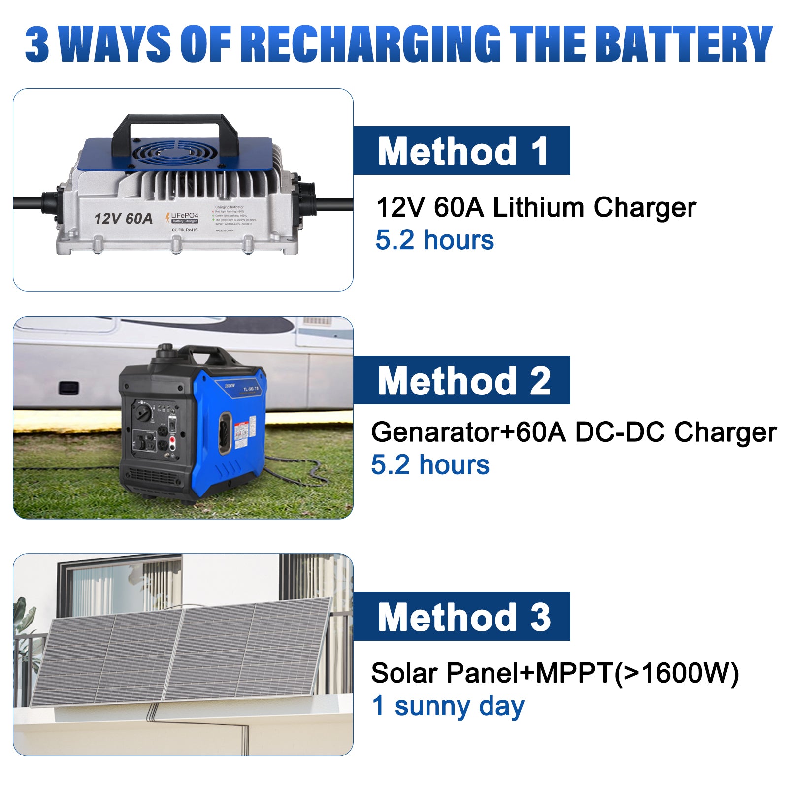 • 3 Charging Methods(LiFePO4 Charger/Solar Panel/Generator) & 10X Charging Efficiency
