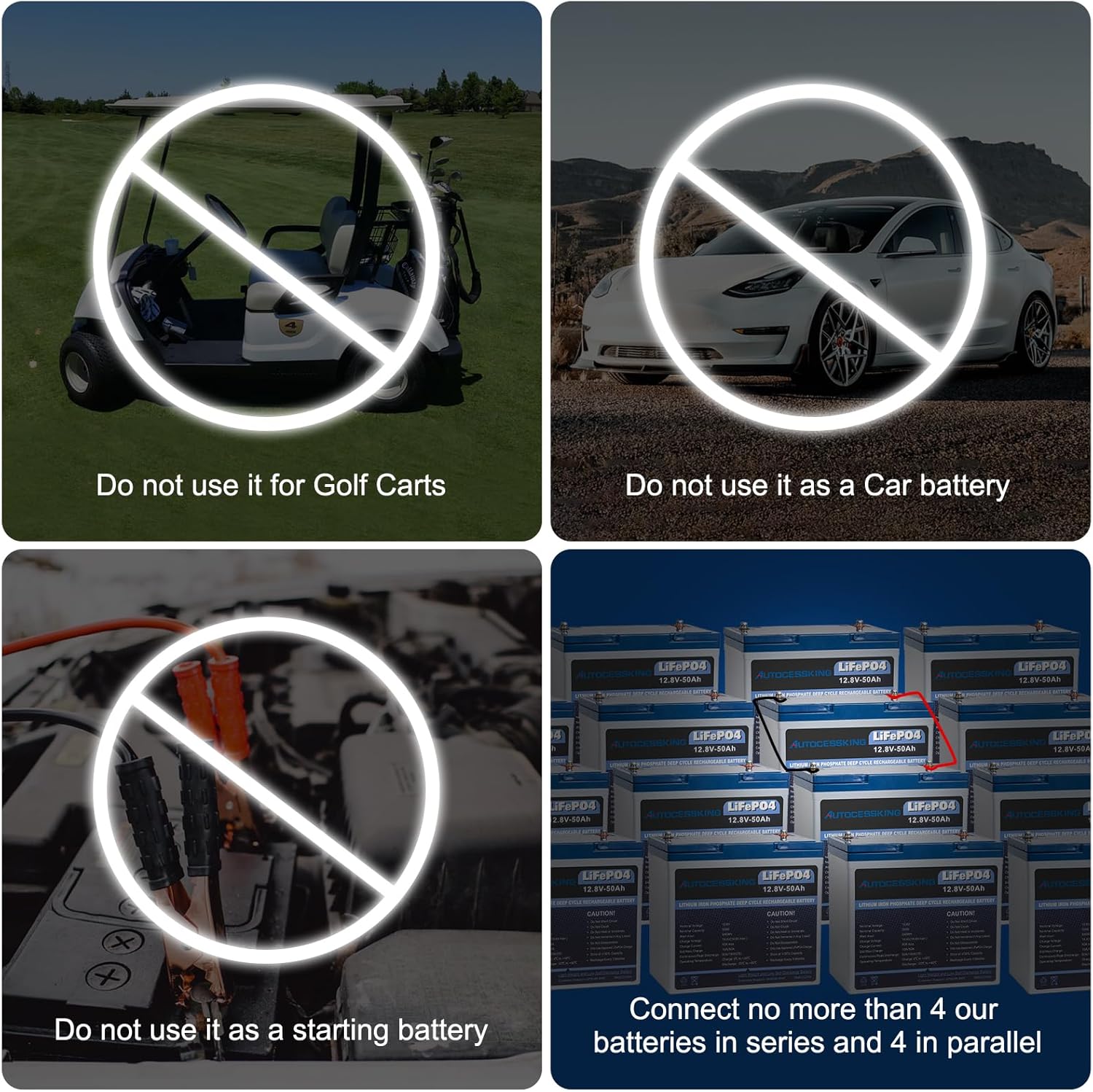 • For optimal performance and safety, always charge the battery with a dedicated LITHIUM BATTERY CHARGER, and avoid connecting more than four batteries in series or parallel.