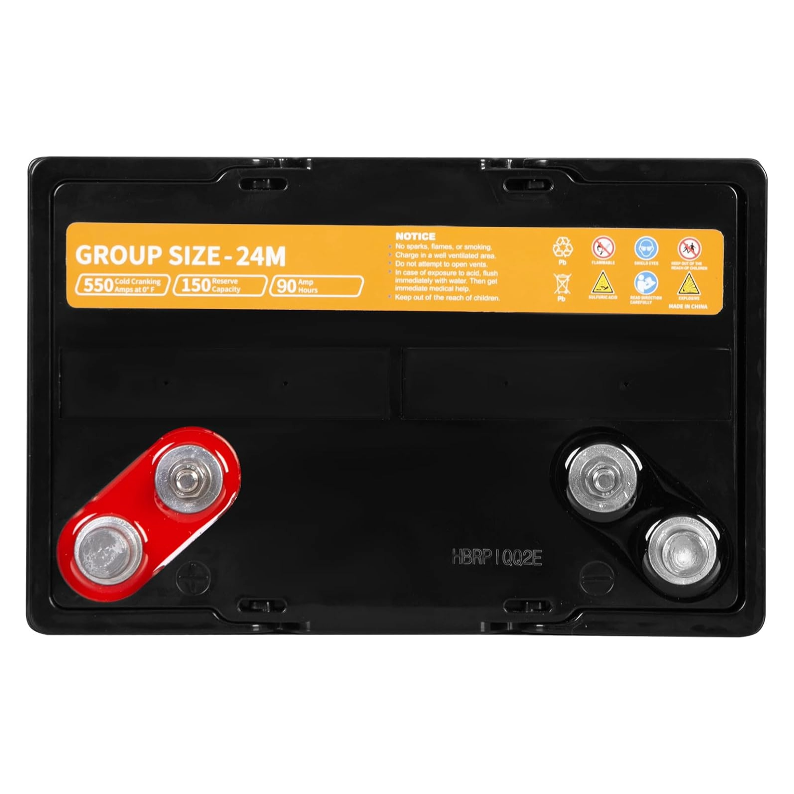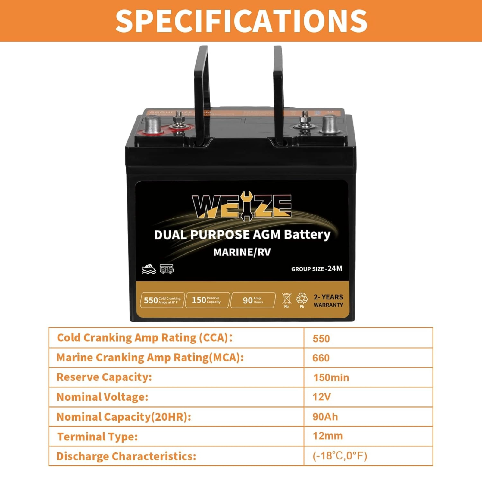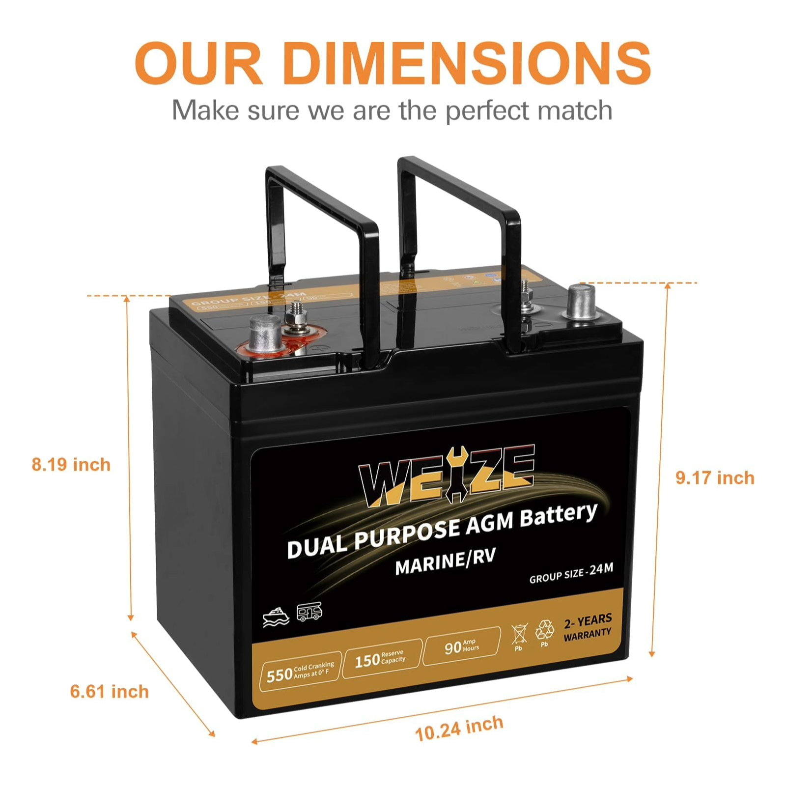 [HIGH PERFORMANCE] Built with advanced AGM (Absorbent Glass Mat) technology, the WEIZE Group 24M delivers high output power and low internal resistance, providing a reliable, long-lasting energy supply. It offers 2x the cycle life of traditional flooded marine batteries. 🔋 Terminal Configuration: Left – Positive (+, Red), Right – Negative (–, Black)