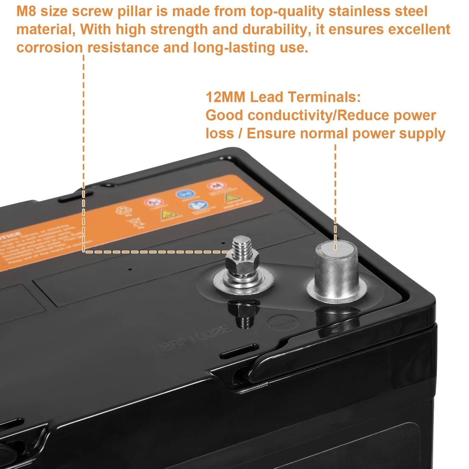 [LOW MAINTENANCE & DURABLE] Enjoy hassle-free power with this virtually maintenance-free battery. It resists corrosion and is built to endure tough environments with 20x more vibration resistance than conventional flooded batteries—ideal for marine, off-road, and RV use.