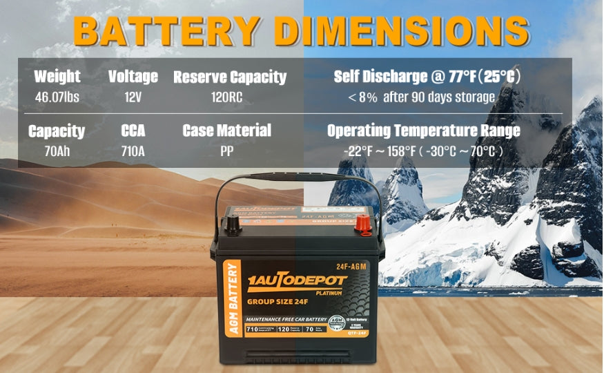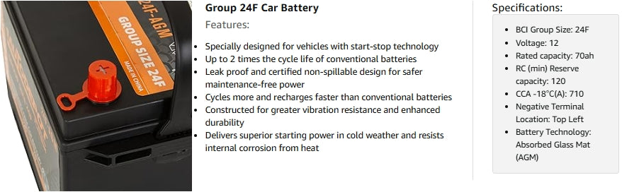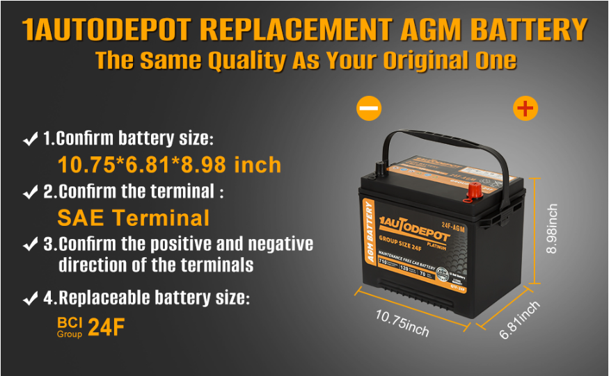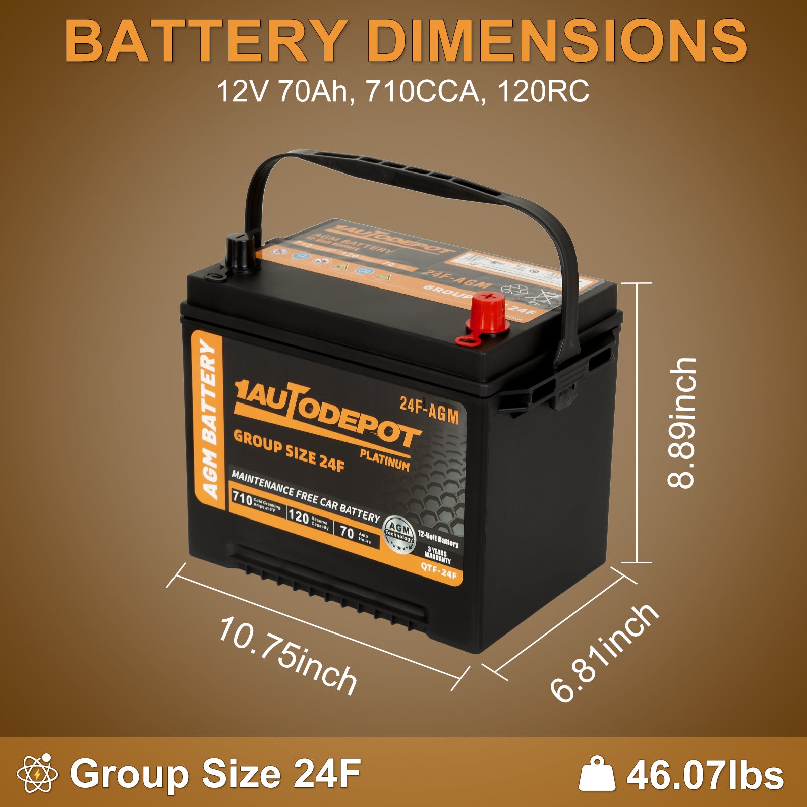 1AUTODEPOT BCI Group Size 24F AGM Car Battery, Start and Stop Automotive Battery 12V 70Ah, 120RC, 710CCA