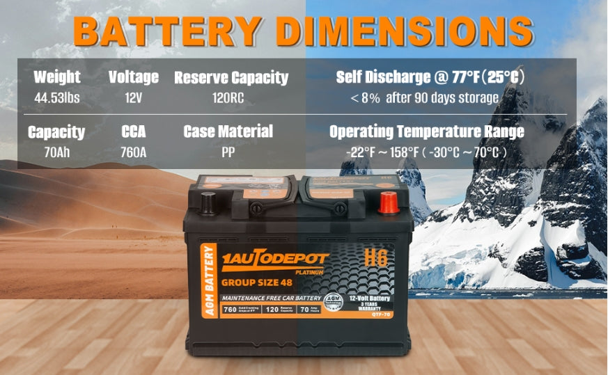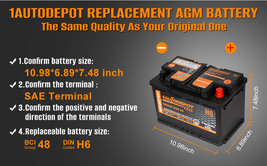1AUTODEPOT BCI Group Size 48 AGM Car Battery, H6 Start and Stop Automotive Battery 12V 70Ah, 120RC, 760CCA