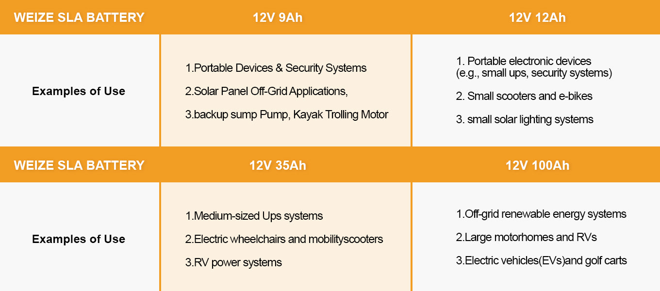 [{"id":435698696420,"handle":"12v-sla-agm-series","updated_at":"2026-02-03T04:19:36-08:00","published_at":"2024-05-09T02:15:38-07:00","sort_order":"manual","template_suffix":"","published_scope":"web","title":"12V SLA AGM Battery Series","body_html":"\u003cp\u003eCombining the best of \u003ca href=\"https:\/\/www.weizeus.com\/collections\/sealed-lead-acid-batteries\" title=\"SLA Batteries\"\u003eSealed Lead Acid (SLA)\u003c\/a\u003e and \u003ca href=\"https:\/\/www.weizeus.com\/collections\/sealed-lead-acid-batteries\" title=\"AGM Batteries\"\u003eAbsorbent Glass Mat (AGM)\u003c\/a\u003e technologies, our series delivers unmatched performance for a wide array of applications. Whether you're powering automotive systems, RVs, marine equipment, or backup power supplies, these batteries are engineered to provide exceptional durability, rapid charging, and consistent power output. With a spill-proof, maintenance-free design, the \u003ca href=\"https:\/\/www.weizeus.com\/collections\/12v-sla-agm-series\" title=\"12V SLA AGM Series\"\u003e12V SLA AGM Series batteries \u003c\/a\u003eoffer unparalleled convenience and peace of mind. Experience the synergy of advanced technology and robust construction, ensuring your devices and vehicles operate at their best. Choose our 12V SLA AGM Series for a power solution that stands the test of time.\u003c\/p\u003e\n\u003ch2\u003eWhy Choose WEIZE Sealed Lead Acid AGM Battery?\u003c\/h2\u003e\n\u003cp\u003e\u003cbr\u003e\u003c\/p\u003e\n\u003cp\u003e🟠 SLA batteries are sealed and do not require regular maintenance, such as checking water levels or equalizing charges.\u003cbr\u003e🟠 Their sealed design reduces the risk of spills and leaks, making them safer to handle and use in different environments.\u003cbr\u003e🟠 SLA batteries are known for their rugged construction and ability to withstand harsh conditions, including temperature variations and vibrations.\u003cbr\u003e🟠 Generally, SLA batteries are less expensive than other types, like lithium-ion batteries, making them a budget-friendly option for many applications.\u003cbr\u003e🟠 They are used in a wide range of applications, from backup power systems and emergency lighting to golf carts and alarm systems.\u003cbr\u003e🟠 SLA batteries provide consistent and reliable performance, with good cycle life and stable voltage output.\u003cbr\u003e🟠 Our batteries have a low self-discharge rate, meaning they can hold their charge for extended periods when not in use.\u003c\/p\u003e\n\u003cp\u003e\u003cbr\u003e\u003c\/p\u003e\n\u003ch2\u003eShop By Application\u003c\/h2\u003e\n\u003cp\u003e\u003cbr\u003e\u003c\/p\u003e\n\u003cp\u003e🔸 \u003ca href=\"https:\/\/www.weizeus.com\/collections\/platinum-auto-battery\" title=\"Car \u0026amp; Truck Battery\"\u003eCar \u0026amp; Truck Battery\u003c\/a\u003e🔸 \u003ca href=\"https:\/\/www.weizeus.com\/collections\/lawn-tractor-mower-battery\" title=\"Lawn Tractor and Mower Battery\"\u003eLawn Tractor \u0026amp; Mower Battery\u003c\/a\u003e🔸 \u003ca href=\"https:\/\/www.weizeus.com\/collections\/golf-cart-batteries\" title=\"Golf Cart Batteries\"\u003eGolf Cart Batteries\u003c\/a\u003e🔸 \u003ca href=\"https:\/\/www.weizeus.com\/collections\/marine-and-boat-battery\" title=\"Marine and Boat Battery\"\u003eMarine \u0026amp; Boat Battery\u003c\/a\u003e\u003c\/p\u003e\n\u003cp\u003e🔸 \u003ca href=\"https:\/\/www.weizeus.com\/collections\/motorcycle-battery\" title=\"ATV \u0026amp; Motorcycle Battery\"\u003eATV \u0026amp; Motorcycle Battery\u003c\/a\u003e🔸 \u003ca href=\"https:\/\/www.weizeus.com\/collections\/camper-and-rv-battery\" title=\"Camper and RV Battery\"\u003eCamper \u0026amp; RV Battery\u003c\/a\u003e🔸 \u003ca href=\"https:\/\/www.weizeus.com\/collections\/scooter-battery\" title=\"Scooter Battery\"\u003eScooter Battery\u003c\/a\u003e🔸 \u003ca href=\"https:\/\/www.weizeus.com\/collections\/trolling-motor-battery\" title=\"Trolling Motor Battery\"\u003eTrolling Motor Battery\u003c\/a\u003e\u003c\/p\u003e","image":{"created_at":"2024-05-09T02:48:49-07:00","alt":"12V SLA AGM Series - WEIZE","width":600,"height":600,"src":"\/\/www.weizeus.com\/cdn\/shop\/collections\/1_5276cca5-1722-44cb-a55b-75073bd7a54c.png?v=1724309434"}},{"id":412262957284,"handle":"best-sellers","updated_at":"2026-02-03T04:19:36-08:00","published_at":"2022-10-07T02:15:47-07:00","sort_order":"manual","template_suffix":"","published_scope":"web","title":"Best Sellers","body_html":"","image":{"created_at":"2023-07-26T00:28:28-07:00","alt":"BEST SELLERS - WEIZE","width":700,"height":700,"src":"\/\/www.weizeus.com\/cdn\/shop\/collections\/12v100ah.png?v=1724309538"}},{"id":436167246052,"handle":"scooter-battery","updated_at":"2026-02-03T04:19:36-08:00","published_at":"2024-05-17T02:33:04-07:00","sort_order":"best-selling","template_suffix":"","published_scope":"web","title":"Scooter Battery","body_html":"\u003cp\u003eDesigned to meet the specific demands of electric scooters, \u003ca href=\"https:\/\/www.weizeus.com\/collections\/scooter-battery\" title=\"Batteries\"\u003eWEIZE batteries\u003c\/a\u003e deliver reliable power and long-lasting performance, ensuring you can enjoy smooth rides wherever your adventures take you. Our \u003ca href=\"https:\/\/www.weizeus.com\/collections\/scooter-battery\" title=\"Scooter Batteries\"\u003escooter batteries\u003c\/a\u003e offer rapid charging, lightweight design, and exceptional durability, making them the perfect choice for daily commuters and weekend explorers alike. Whether you're zipping through city streets or cruising along scenic paths, our scooter batteries provide the energy you need to keep moving forward. Choose our scooter batteries and experience the freedom of efficient, eco-friendly transportation.\u003cbr\u003e\u003c\/p\u003e\n\u003ch2\u003eWhy Choose WEIZE Scooter battery?\u003cbr\u003e\n\u003c\/h2\u003e\n\u003cp\u003e\u003cbr\u003e\u003c\/p\u003e\n\u003cp\u003e🟠 WEIZE scooter batteries are designed t