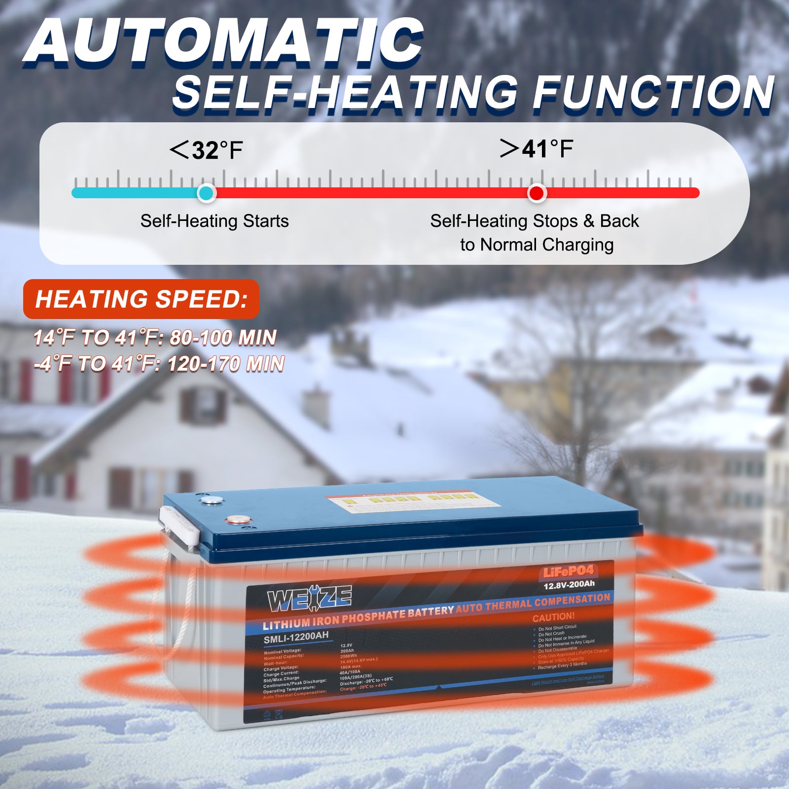 This particular model comes with a built-in heating element that ensures the battery operates efficiently in cold temperatures. Lithium batteries, especially LiFePO4 batteries, can lose capacity and performance in freezing conditions (below 32°F or 0°C), so the integrated heating system helps maintain optimal performance by keeping the battery at a suitable temperature.