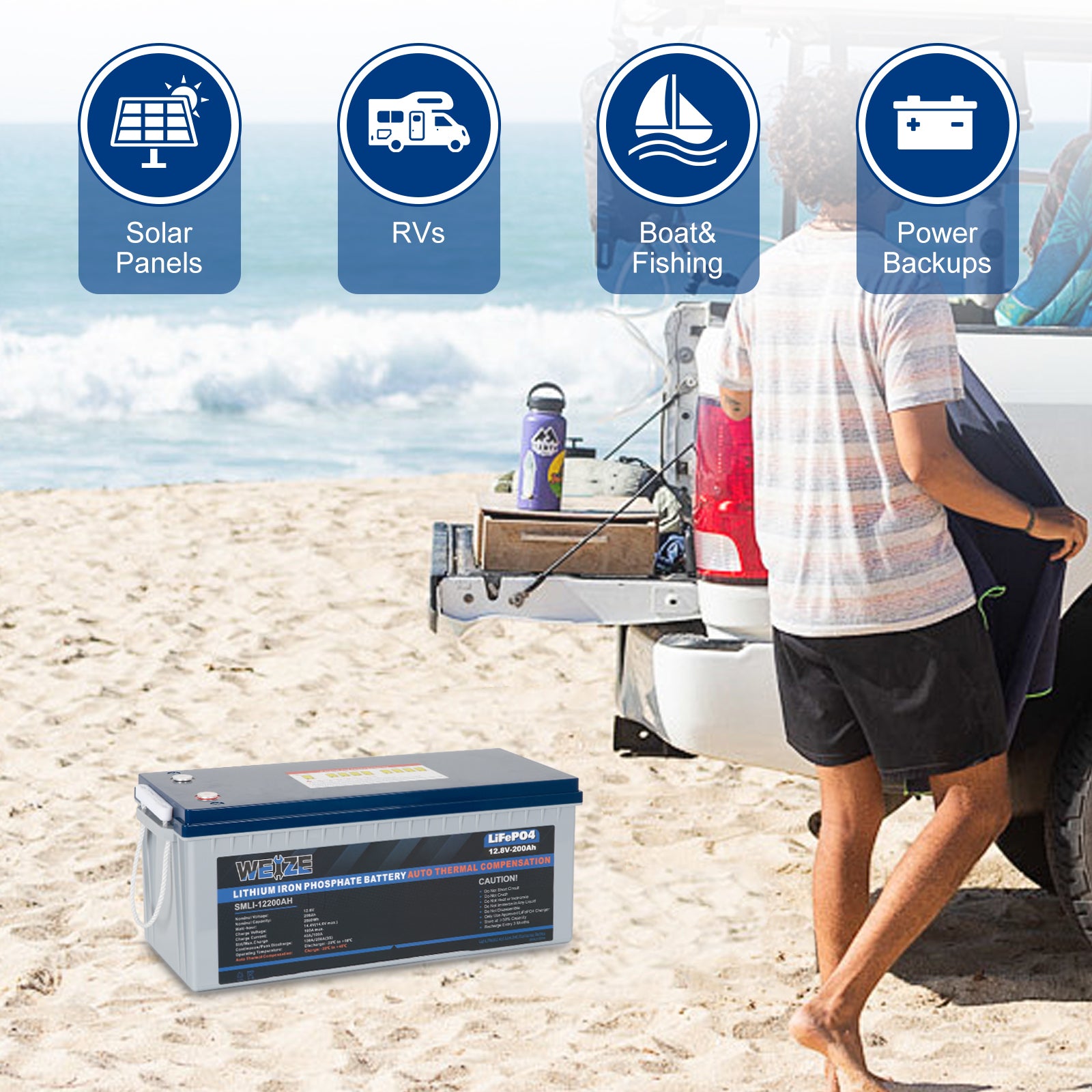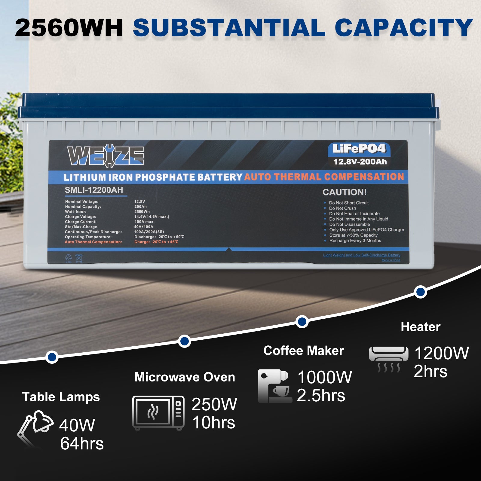 The WEIZE 12V 200Ah 2560Wh Heated LiFePO4 Lithium Battery is a high-capacity rechargeable battery designed primarily for applications that require reliable, long-lasting power, such as RVs, boats, solar power systems, and other off-grid energy systems. Here's a breakdown of what makes this battery special: