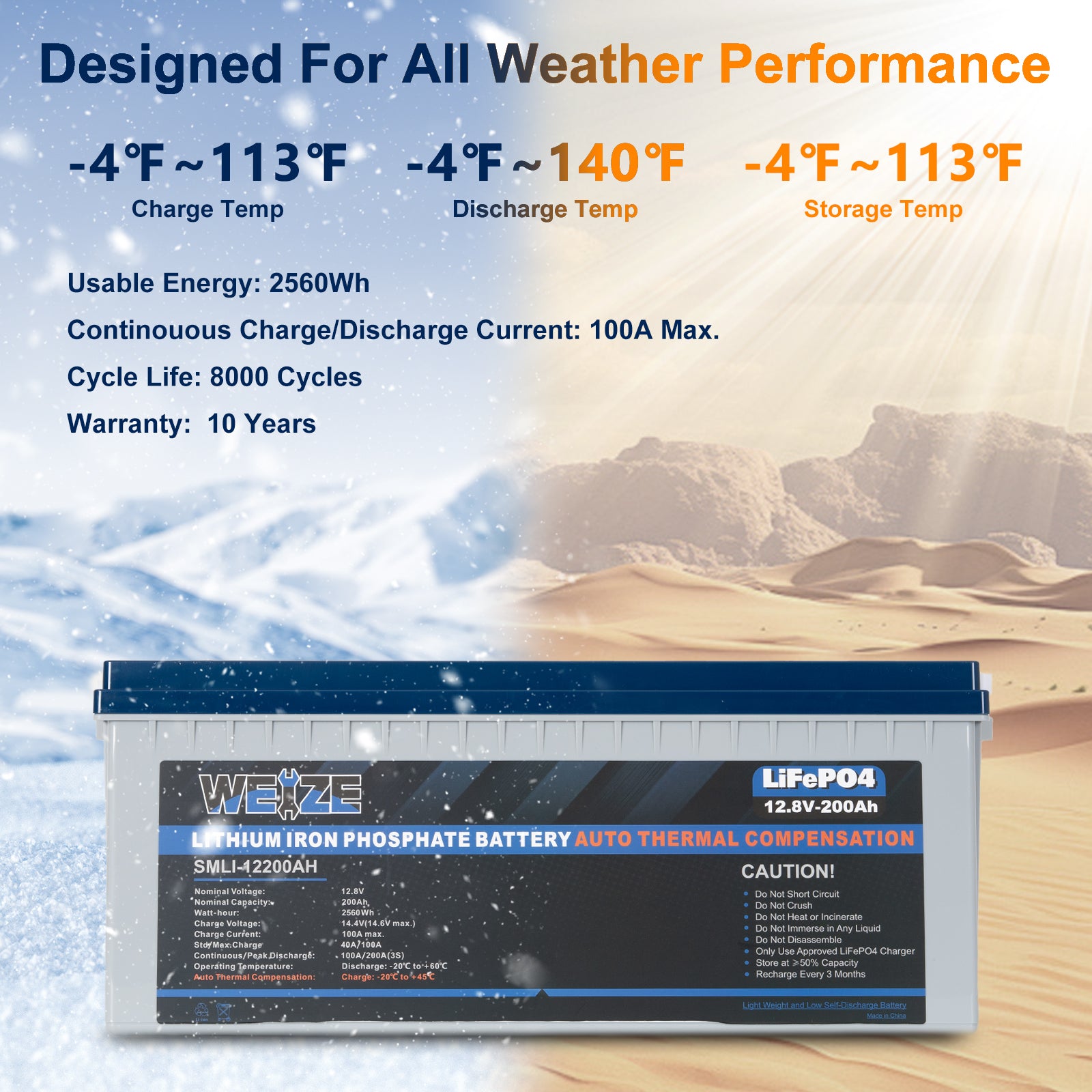 The WEIZE 12V 200Ah 2560Wh Heated LiFePO4 Lithium Battery is an excellent choice for anyone looking for a durable, efficient, and reliable power source in environments where cold temperatures can impact performance. Whether for RVs, solar power systems, or marine use, this battery offers the capacity, safety, and longevity needed for off-grid living and outdoor activities.