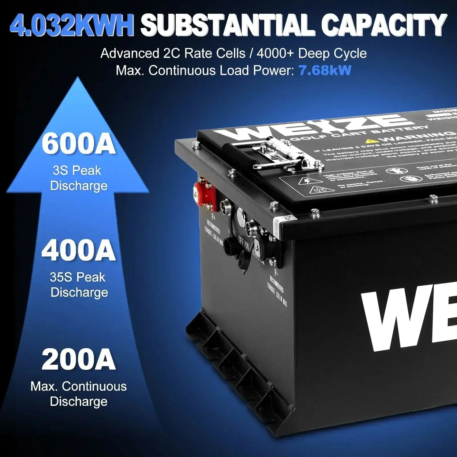WEIZE 38.4V battery offers an impressive 105Ah capacity and delivers a powerful 7.68kW output, ideal for golf carts tackling various terrains over long distances. Designed for durability, this battery has over 4000 recharge cycles—significantly outlasting traditional lead-acid batteries, which typically last only 300 to 500 cycles.