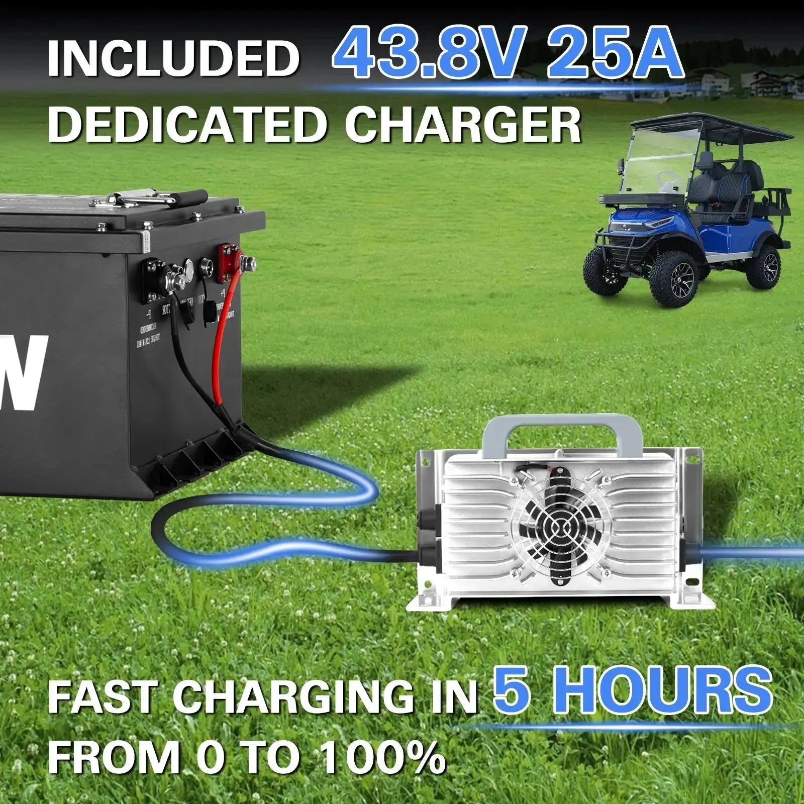 This battery is compatible with most golf carts and comes with a 43.8V 25A charger, ensuring fast recharging to minimize downtime. Stay powered up and ready to go with quick, efficient charging whenever you need it.