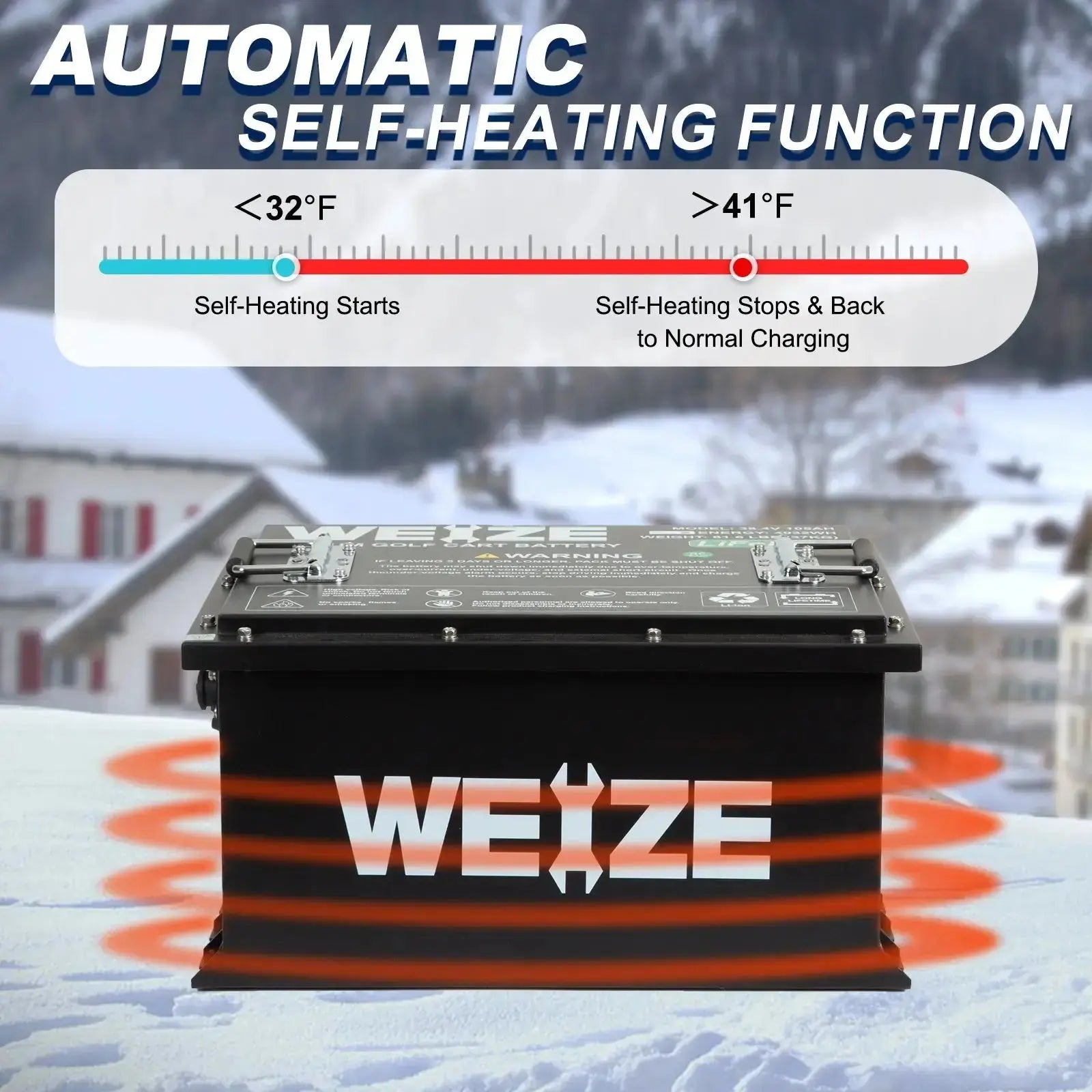 Keep your golf cart powered year-round with this advanced temperature-protected battery. Designed with a low-temperature cut-off, it automatically stops charging below 24°F, preventing potential damage. When temperatures rise above 32°F, charging seamlessly resumes. For added protection, the battery also halts discharge below -4°F, ensuring reliable performance in extreme cold.