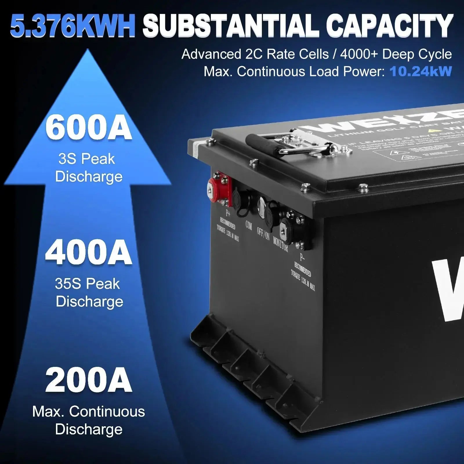 The WEIZE 51.2V 105Ah battery provides a powerful 10.24kW output, designed to support golf carts over long distances and rough terrains. With over 4,000 recharge cycles, this battery lasts far longer than traditional lead-acid batteries, which typically last between 300 and 500 cycles.
