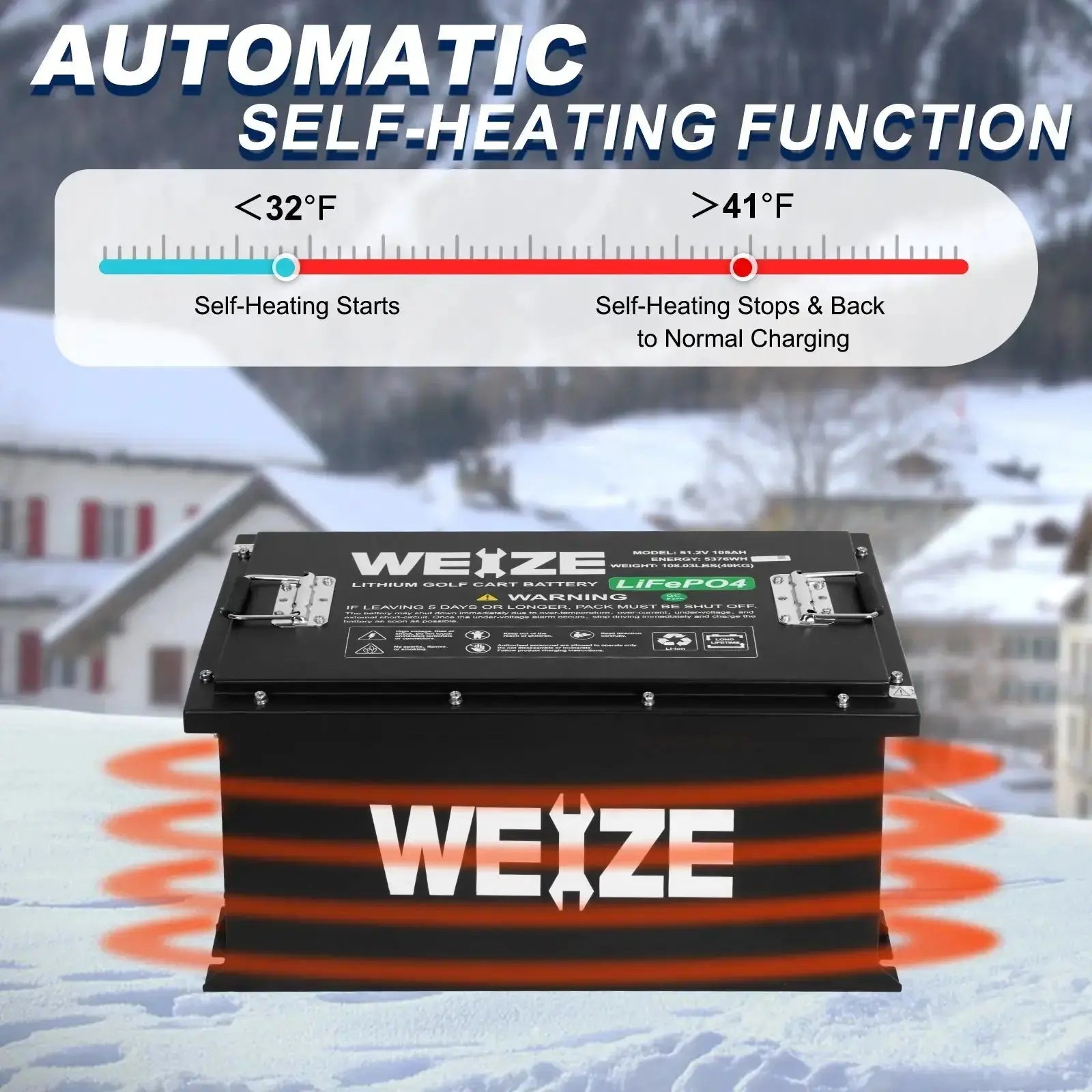 Stay powered in cold conditions with the automatic self-heating function. When temperatures drop below 32°F, the battery activates its self-heating system to maintain optimal performance. Once the temperature rises above 41°F, the self-heating stops, and normal charging resumes. This smart feature ensures efficient charging and reliable power, even in freezing weather, making it perfect for cold-climate use.