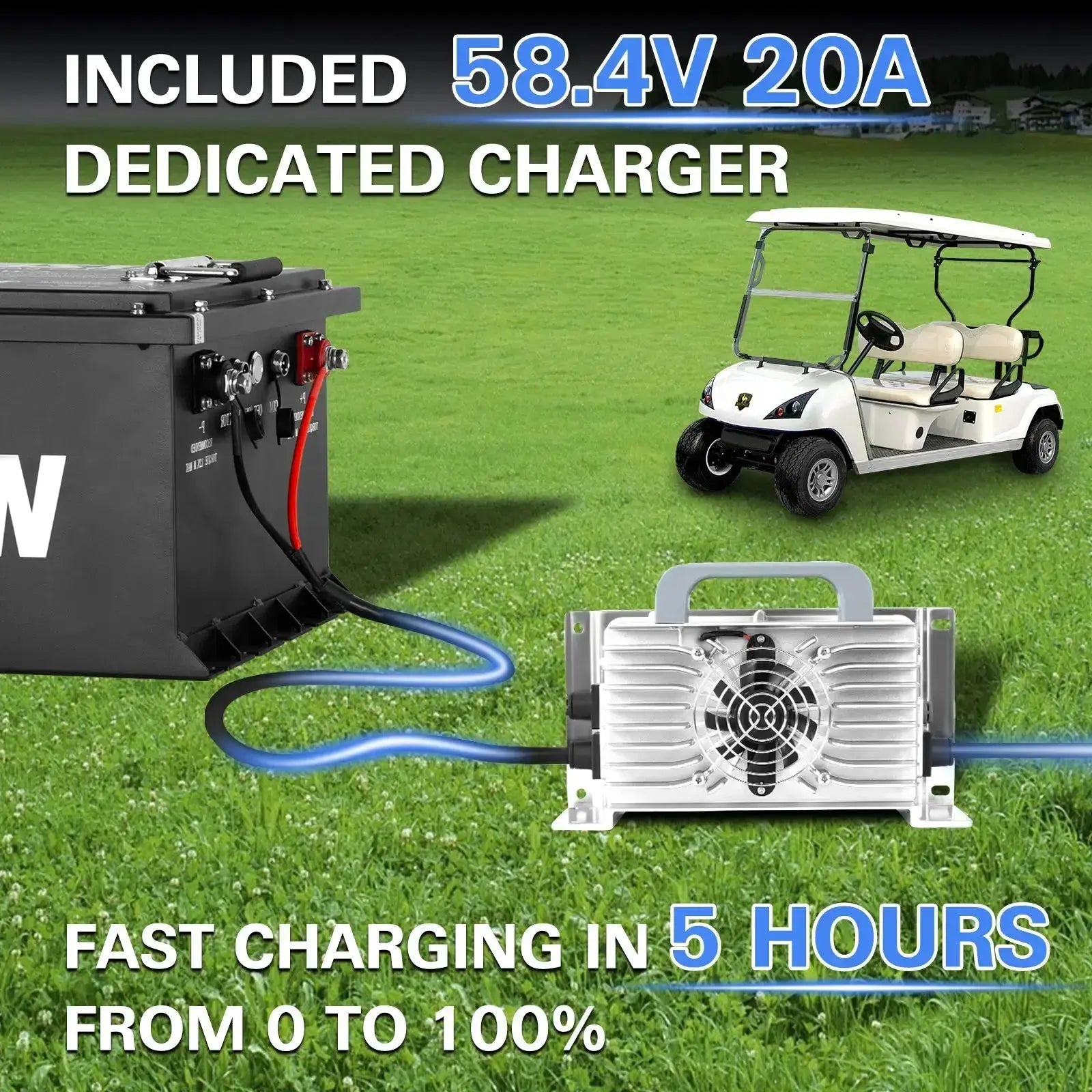 This battery is compatible with most golf carts and comes with a 58.4V 20A charger, ensuring fast recharging to minimize downtime. Stay powered up and ready to go with quick, efficient charging whenever you need it.