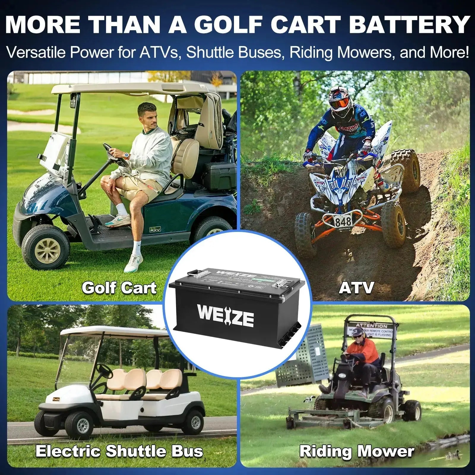 [{"id":412262957284,"handle":"best-sellers","updated_at":"2026-02-03T04:19:36-08:00","published_at":"2022-10-07T02:15:47-07:00","sort_order":"manual","template_suffix":"","published_scope":"web","title":"Best Sellers","body_html":"","image":{"created_at":"2023-07-26T00:28:28-07:00","alt":"BEST SELLERS - WEIZE","width":700,"height":700,"src":"\/\/www.weizeus.com\/cdn\/shop\/collections\/12v100ah.png?v=1724309538"}},{"id":457546662116,"handle":"bluetooth-lifepo4-lithium-batteries","updated_at":"2026-02-03T16:48:49-08:00","published_at":"2025-04-20T20:32:43-07:00","sort_order":"manual","template_suffix":"","published_scope":"web","title":"Bluetooth LiFePO4 Lithium Batteries","body_html":"\u003cp\u003ePower meets precision with WEIZE’s advanced LiFePO4 lithium batteries featuring built-in Bluetooth technology. Monitor real-time performance, state of charge, temperature, and more—right from your smartphone. Whether you're upgrading your RV, solar system, boat, or off-grid setup, these smart batteries deliver long-lasting, reliable energy with total visibility and control.\u003c\/p\u003e"},{"id":440039604452,"handle":"golf-cart-batteries","updated_at":"2026-02-03T21:54:42-08:00","published_at":"2024-07-14T22:51:07-07:00","sort_order":"manual","template_suffix":"","published_scope":"web","title":"Golf Cart Battery","body_html":"\u003cp\u003eWhether you need reliable performance for your electric golf cart, enhanced durability for off-road excursions, or efficient energy storage for your golf course fleet, we have the perfect battery solutions. Our selection features advanced technologies, including lithium-ion and AGM batteries, ensuring long-lasting power, quick charging, and superior performance. Explore our range today and find the ideal battery to keep your \u003ca href=\"https:\/\/www.weizeus.com\/collections\/golf-cart-batteries\" title=\"Golf Cart Batteries\"\u003egolf cart\u003c\/a\u003e running smoothly and efficiently!\u003c\/p\u003e\n\u003ch2\u003eWhy Choose WEIZE Golf Cart batteries?\u003c\/h2\u003e\n\u003cp\u003e\u003cbr\u003e\u003c\/p\u003e\n\u003cp\u003e🟠 WEIZE Golf Cart batteries are designed for deep cycle use, meaning they can be discharged and recharged multiple times without losing capacity. This is essential for golf carts, which require sustained power over extended periods of use.\u003cbr\u003e🟠 Built with high-quality materials, WEIZE batteries are designed to withstand the rigors of frequent use and tough environments, providing long-lasting performance and reducing the need for frequent replacements. These batteries provide steady and reliable power, ensuring your golf cart operates smoothly throughout the day without sudden drops in performance.\u003cbr\u003e🟠 WEIZE batteries offer high energy capacity, allowing your golf cart to run for longer periods on a single charge. This is particularly important for extended use on large golf courses or during long outings. Designed to resist vibrations and shocks, WEIZE batteries are well-suited for the bumpy terrain often encountered on golf courses, ensuring durability and consistent performance.\u003cbr\u003e🟠 WEIZE Golf Cart batteries are designed to charge efficiently, so you can get your cart back on the course faster with minimal downtime.\u003cbr\u003e🟠 These batteries perform well in a range of temperatures and weather conditions, ensuring dependable operation whether you’re golfing in the heat of summer or the chill of early morning. Offering a balance of quality, durability, and affordability, WEIZE Golf Cart batteries provide excellent value, making them a cost-effective solution for your golf cart power needs.\u003c\/p\u003e\n\u003ch2\u003eShop By Application\u003c\/h2\u003e\n\u003cp\u003e\u003cbr\u003e\u003c\/p\u003e\n\u003cp\u003e🔸 \u003ca href=\"https:\/\/www.weizeus.com\/collections\/platinum-auto-battery\" title=\"Car \u0026amp; Truck Battery\"\u003eCar \u0026amp; Truck Battery\u003c\/a\u003e🔸 \u003ca href=\"https:\/\/www.weizeus.com\/collections\/lawn-tractor-mower-battery\" title=\"Lawn Tractor and Mower Battery\"\u003eLawn Tractor \u0026amp; Mower Battery\u003c\/a\u003e🔸 \u003ca href=\"https:\/\/www.weizeus.com\/collections\/golf-cart-batteries\" title=\"Golf Cart Batteries\"\u003eGolf Cart Batteries\u003c\/a\u003e🔸 \u003ca href=\"https:\/\/www.weizeus.com\/collections\/marine-and-boat-battery\" title=\"Marine and Boat Battery\"\u003eMarine \u0026amp; Boat Battery\u003c\/a\u003e\u003c\/p\u003e\n\u003cp\u003e🔸 \u003ca href=\"https:\/\/www.weizeus.com\/collections\/motorcycle-battery\" title=\"ATV \u0026amp; Motorcycle Battery\"\u003eATV \u0026amp; Motorcycle Battery\u003c\/a\u003e🔸 \u003ca href=\"https:\/\/www.weizeus.com\/collections\/camper-and-rv-battery\" title=\"Camper and RV Battery\"\u003eCamper \u0026amp; RV Battery\u003c\/a\u003e🔸 \u003ca href=\"https:\/\/www.weizeus.com\/collections\/scooter-battery\" title=\"Scooter Battery\"\u003eScooter Battery\u003c\/a\u003e🔸 \u003ca href=\"https:\/\/www.weizeus.com\/collections\/trolling-motor-battery\" title=\"Trolling Motor Battery\"\u003eTrolling Motor Battery\u003c\/a\u003e\u003c\/p\u003e","image":{"created_at":"2024-07-14T22:51:36-07:00","alt":"Golf Cart Batteries - WEIZE","width":1080,"height":1080,"src":"\/\/www.weizeus.com\/cdn\/shop\/collections\/aee5fd0bd1a522ef588e0e86dd8684d1.png?v=1741051113"}},{"id":454255837412,"handle":"lifepo4-lithium-battery","updated_at":"2026-02-03T16:48:49-08:00","published_at":"2025-03-06T00:43:19-08:00","sort_order":"best-selling","template_suffix":"","published_scope":"web","title":"LiFePO4 Lithium Battery","body_html":"\u003ch1 class=\"template-header--title h2\"\u003eLiFePO4 Battery\u003c\/h1\u003e\n\u003cdiv class=\"max-height--inner\"\u003e\n\u003cdiv class=\"max-height--inner-content rte\"\u003e\n\u003cp\u003e\u003cstrong\u003eWEIZE \u003c\/strong\u003erechargeable batteries are quickly becoming the preferred choice for many applications, thanks to their high energy den