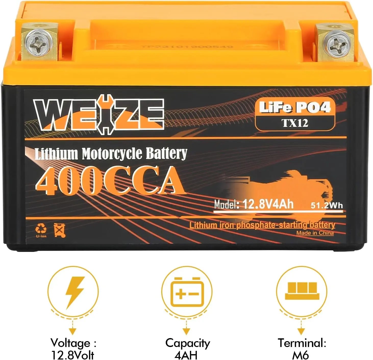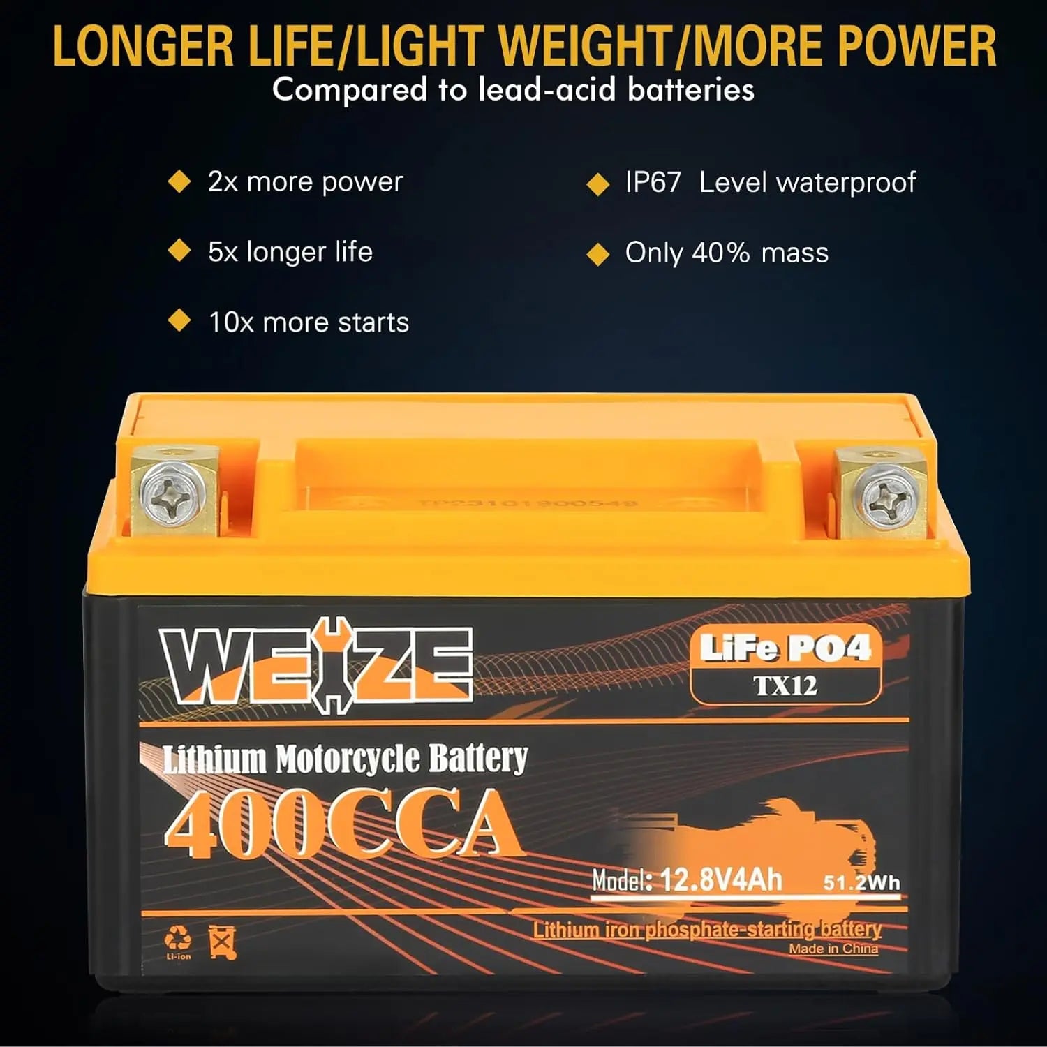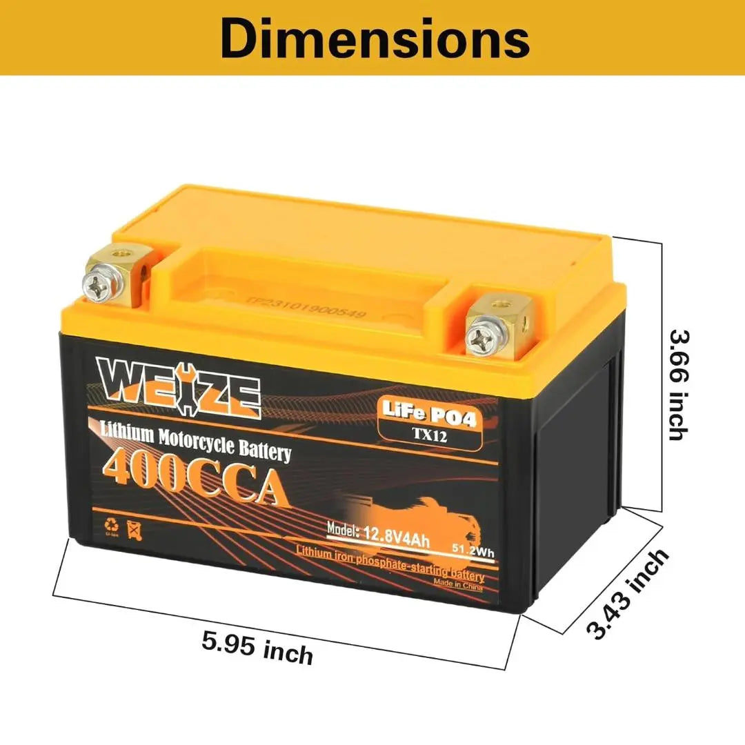 WEIZE 12V 4AH 400CCA LiFePO4 Lithium Motorcycle Battery