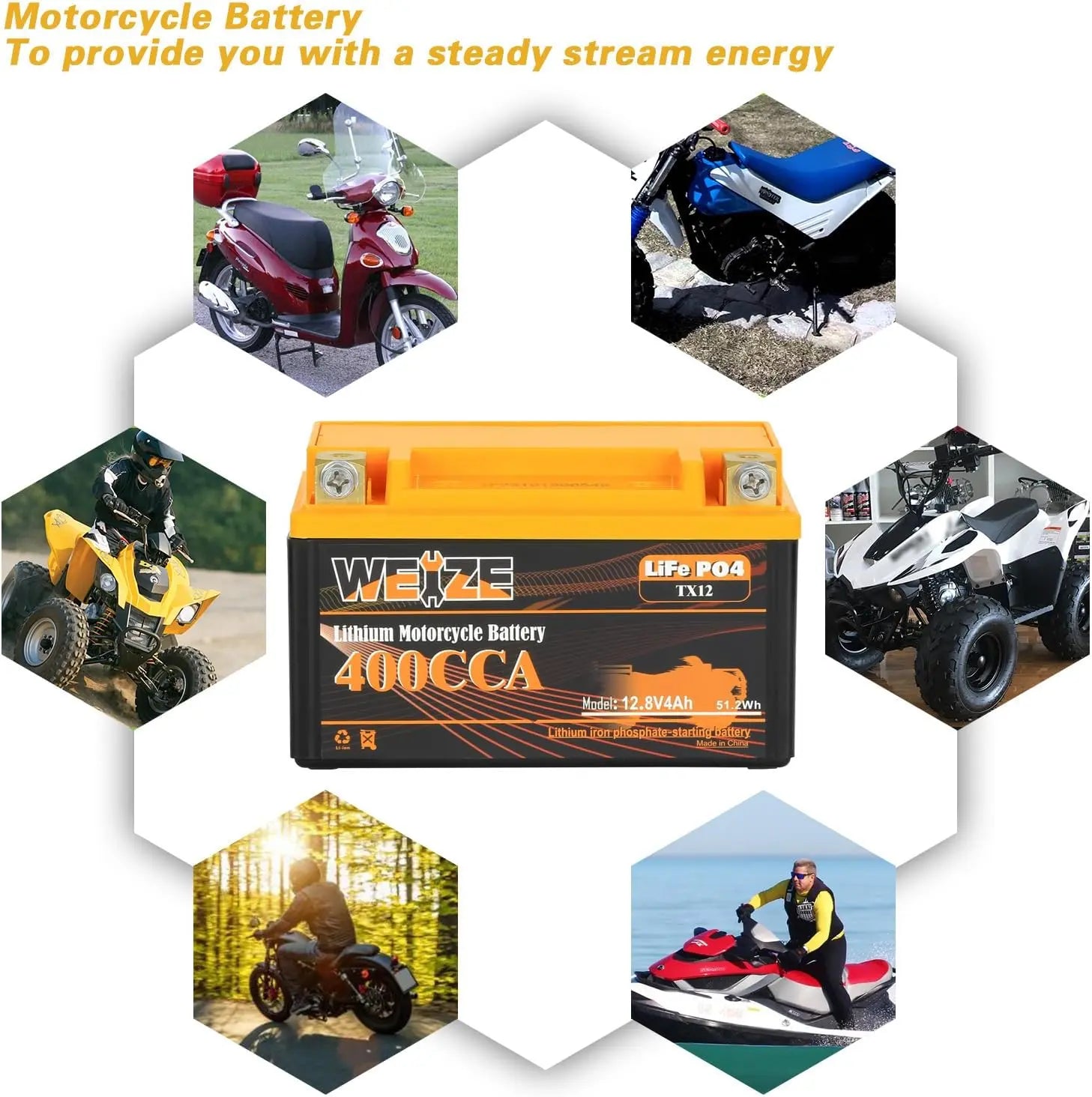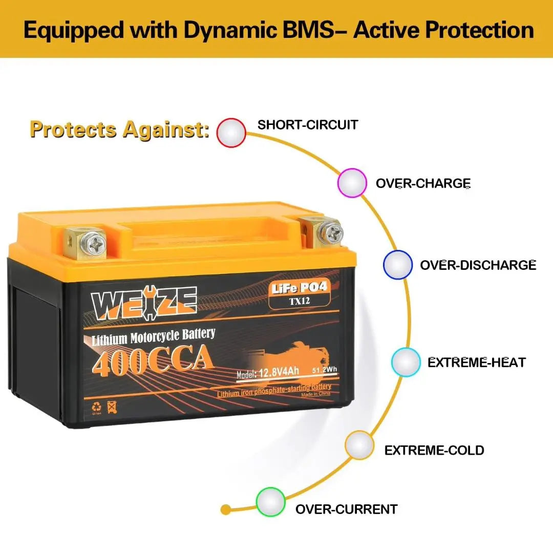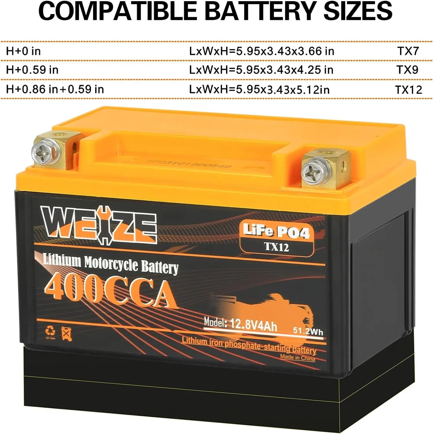 WEIZE 12V 4AH 400CCA LiFePO4 Lithium Motorcycle Battery